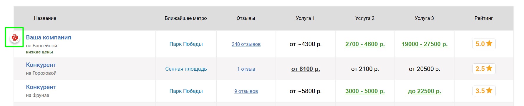Иконка 16х16 пикселей будет отображаться слева от названия вашей фотостудии в таблицах, выделяя её среди прочих. Опция увеличивает вероятность перехода на страницу компании и рекомендуется в качестве дополнения к прочим методам продвижения, в первую очередь для фотостудий с узнаваемым брендом.